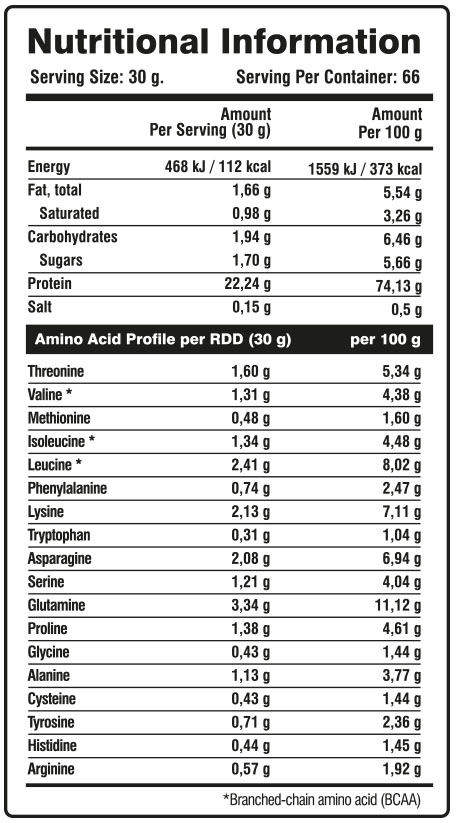 Mélanger 1 scoop (30 g) avec 200–250 ml d’eau ou de lait froid. Consommer 1 à 2 fois par jour, de préférence :
