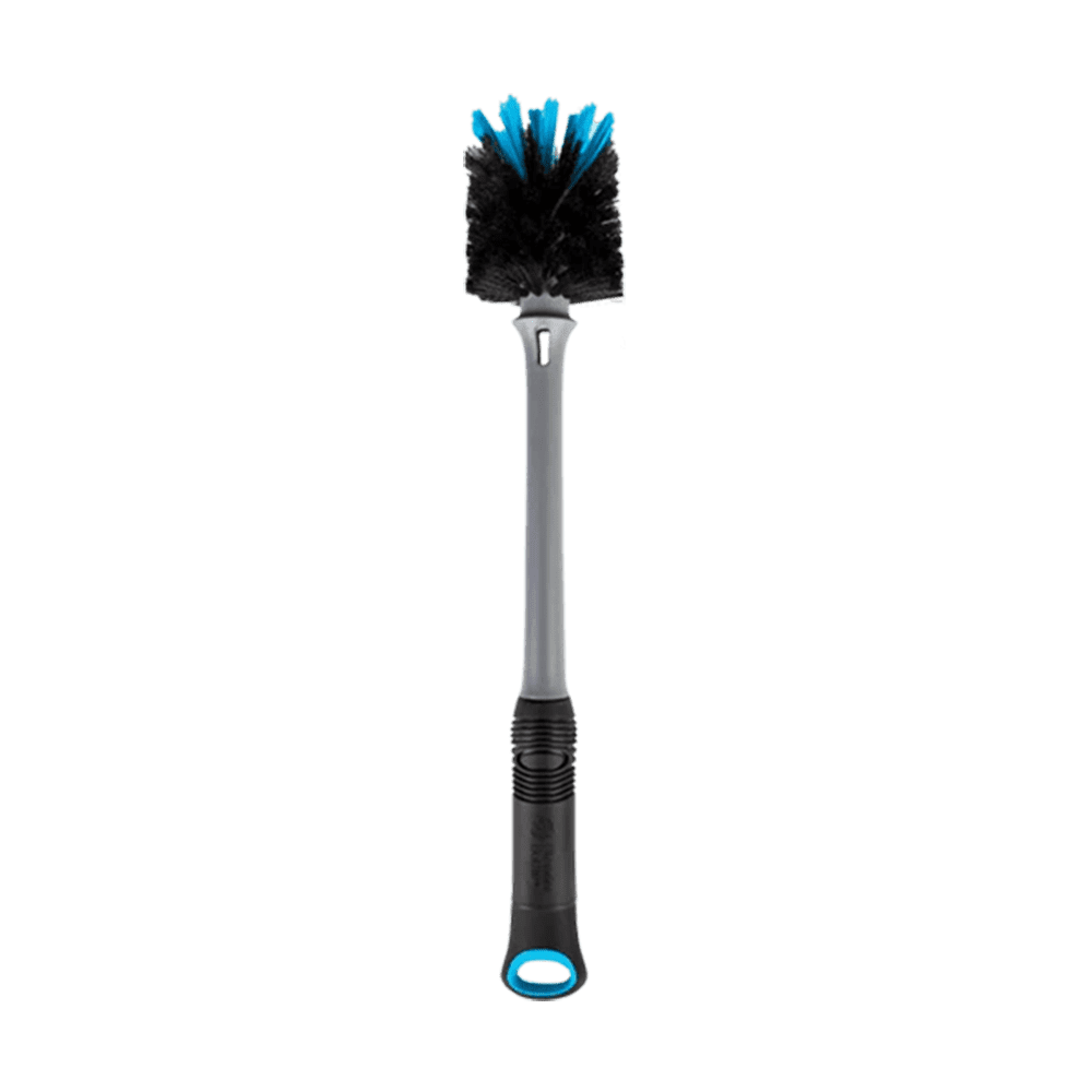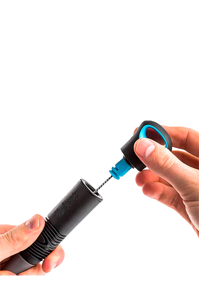 Lorsqu’elle n’est pas utilisée, la mini-brosse dévissable se range soigneusement dans le manche de la brosse à bouteille.