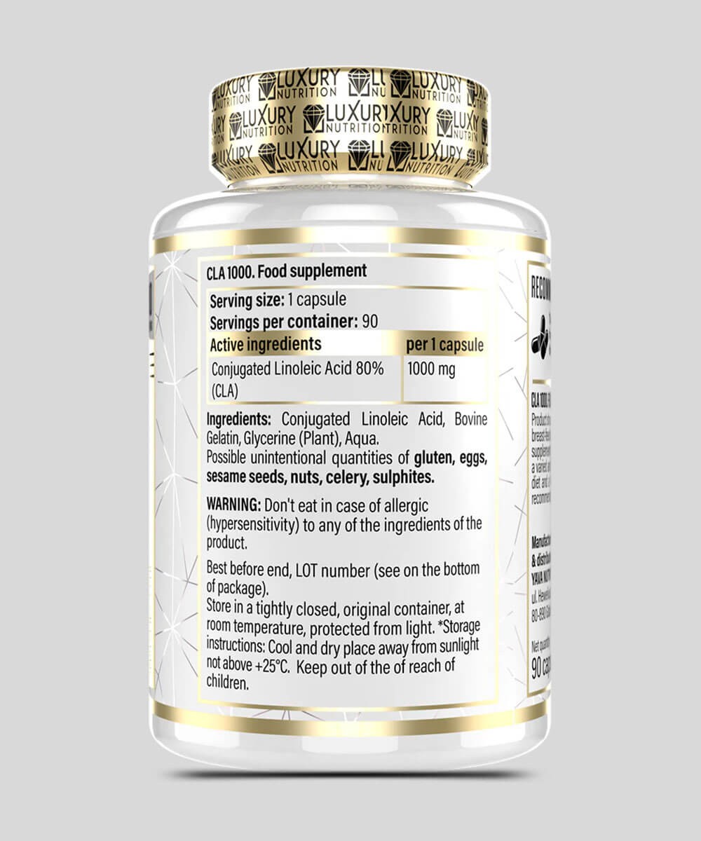 CLA 1000 – 90 capsules de Luxury Nutrition est un complément alimentaire puissant formulé à base d’acide linoléique conjugué (CLA), destiné à soutenir la gestion du poids, favoriser une composition corporelle équilibrée et contribuer à une silhouette plus ferme. Chaque capsule apporte une dose concentrée de 1000 mg de CLA de haute qualité, pour aider le corps à optimiser l’utilisation des graisses dans le cadre d’un mode de vie sain.