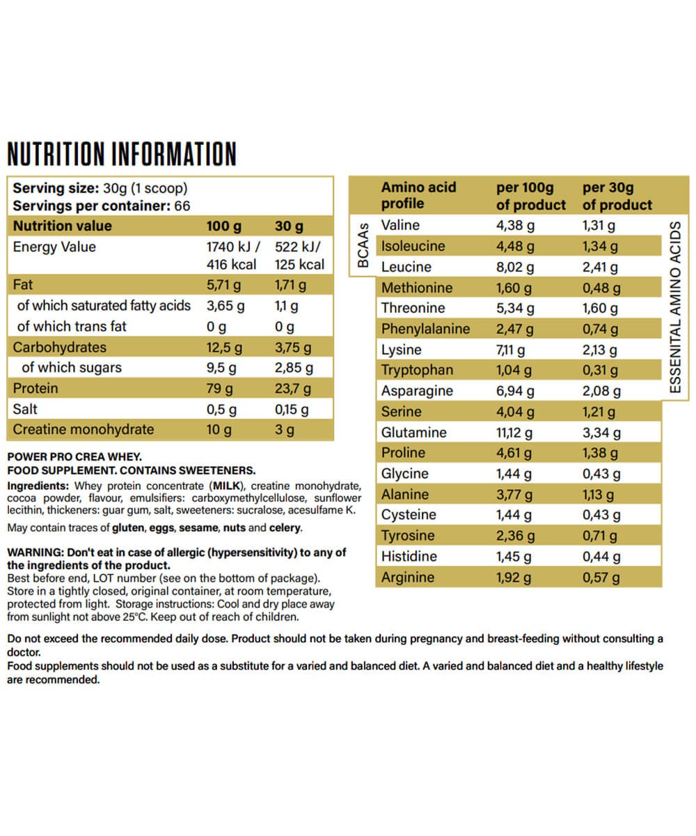 Concentré de protéines de lactosérum (LAIT), créatine monohydrate, cacao en poudre, arôme, émulsifiants : carboxyméthylcellulose, lécithine de tournesol, épaississants : gomme de guar, sel, édulcorants : sucralose, acésulfame K